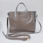 Mini Tote en cuir, mélange de cuir grainé taupe, daim gris, cuir lisse bronze.