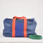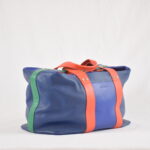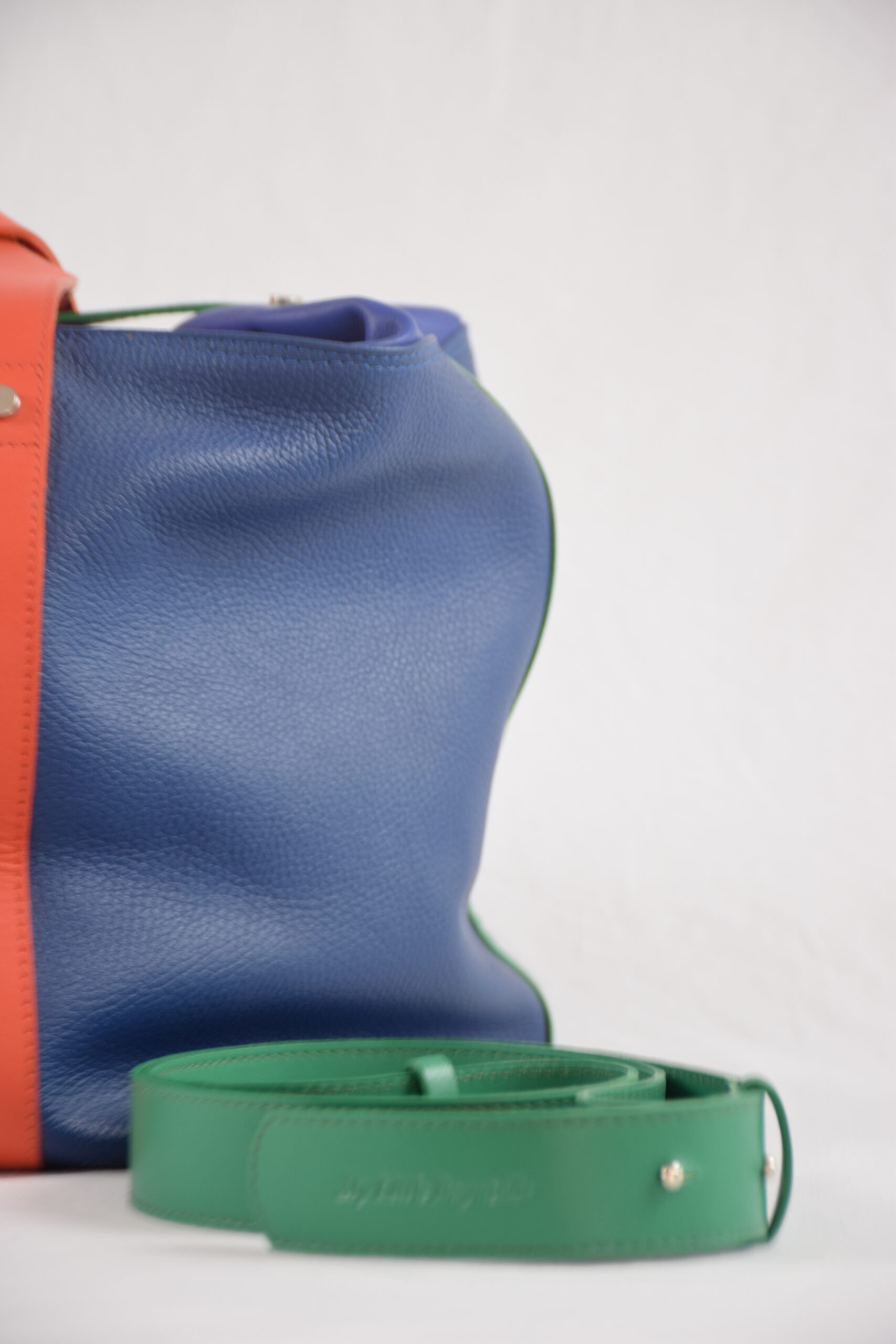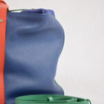 Mélange de cuir souple bleu nuit, bleu saphir, corail et vert.